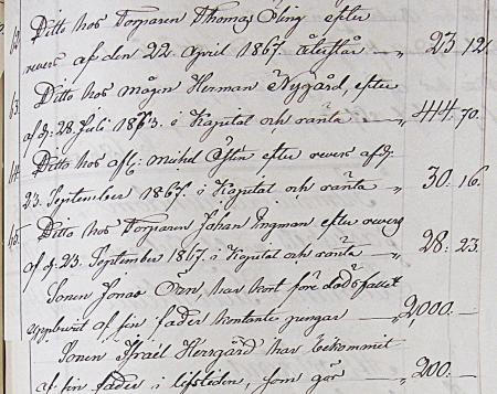 En del av bouppteckningen efter Bonden ”Bankiren” Jonas Jonasson Örn i Vassor som avled 1 mars 1874. Fordringar 72 st. på totalt ca 17.700,- mark . Något över hälfter av låntagarna är Vassorbor. Fastigheten värderades till 3.000,- mark. Hans far var en av "bankirerna" som drunknade utanför Tiondholmen 1825. Bankirer.