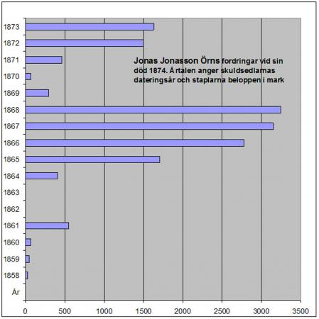 Jonas Jonasson Örns utlåning åren 1858–1873. Observera ökningen under hungeråren 1866–1868.