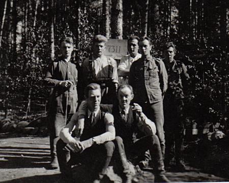 Stående andra fr. v. Sigurd Nykvist, mannen med " Kesso papiross" är Victor Ahlskog (Kurir). Soldater
