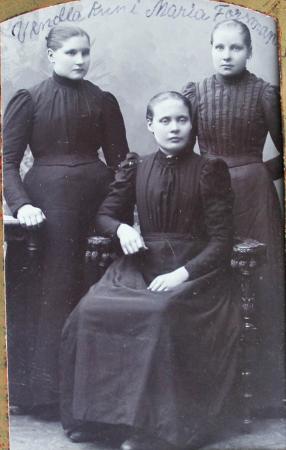 Vendla Kuni g. Klemets f. 1884 och Maria Kuni g. Forsman g. Nymark f. 1878, Ellen Kunis mor och moster. (sittande okänd).