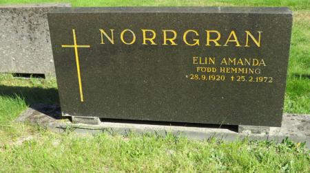 Norrgran Elin Amanda f. Hemming 28/9 1920 – 25/2 1972 (Från Malax; make: Ralf Norrgran, Norrstu, bosatt i Sverige)