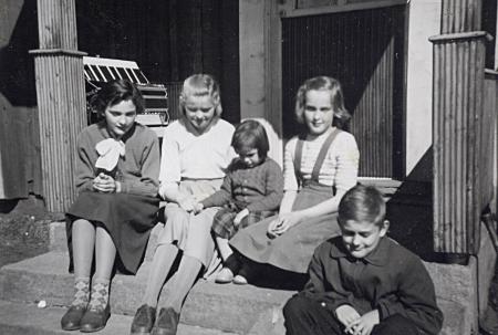 På trappan vid Åbergs. Vivan Åberg g. Wik, Christina Åberg g. Rådman, Carita Åberg g. Antell, Eivor Åberg g. Svarvar och Ole Åberg. Kusiner och syskon. Dragspelet tillhörde Viking Åberg.