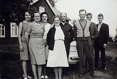 Grannarna på besök vid Åbergs på Västerbacken. Eivor Åberg, Ingrid Åberg, Vivan Åberg, Elna Öman, Erik Öman, Arvid Åberg, Per-Erik Öman och Kaj Öman.