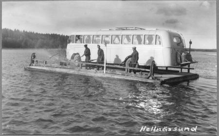 Haldins buss på färjan i Hällnäs. Paul Henriksson var långvarig chaufför på linje Vasa-Österö. En stor mängd varor tranporterades med bussen. Bl.a. mjölk till mejeriet i Kaitsor under 1950-talet.