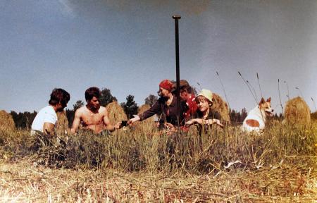 Paus i höbärgningen i Stensund ”på Kurtas”. Fr.v. okänd, Rodney Östman, Dagny Östman, Kurt Östman, Sören Östman och hunden Paavo.