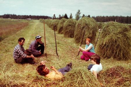 Paus i höbärgningen i Stensund ”på Kurtas”.. Fr.v. Kurt Östman, Robert Östman, Karl-Gustav Heir, Elin Östman och Helena Östman g. Heir.
