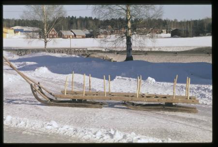 Släde, skrava, på två stöttingar med fimmelstänger. Skravan användes i skogen och till att köra ut gödsel med. Gödseln, dyngan hölls på plats med bräder både i bottnen och på sidorna. För hökörning lyftes skravan bort och ersattes med en höskrinda (höskrind). Se bild 2553.00