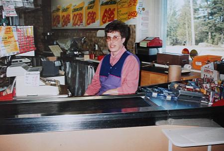 Kvevlax Andelshandel, Kuni butiken, Benita Hinders i kassan. Anteckning bakpå fotot: ”Till Benita, Den glada o vänliga Frun, Hälsningar fr. Elvi o. Oskar.”