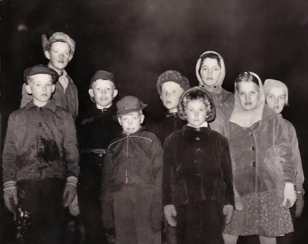 Påskbrasa 1956 på Storhällan Norribyn. Från vänster: Rolf Mälsor, Viking Åberg, Håkan Lundberg, Bjarne Udd, Alf Gunnar Wasberg, Marita Mälsor g. Wikblom, Vivan Åberg g. Wik, Birgit Udd och Eivor Åberg g. Svarvar. Det var syskon, kusiner och grannar som eldade påskbrasa.