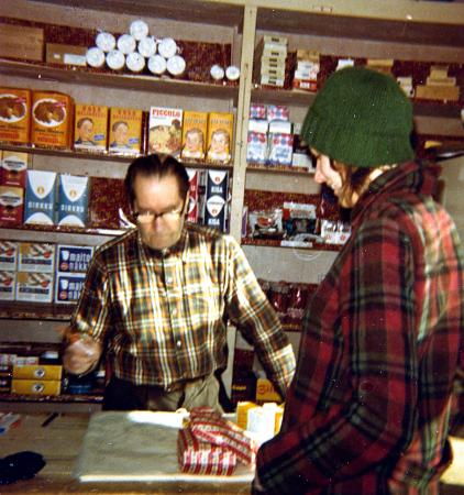 Emil Rabb betjänar Rakel Wasberg g. Holm i sin butik på Löte. På disken ligger en bunt omslagspapper där varuinköpen skrev upp och adderades ihop.