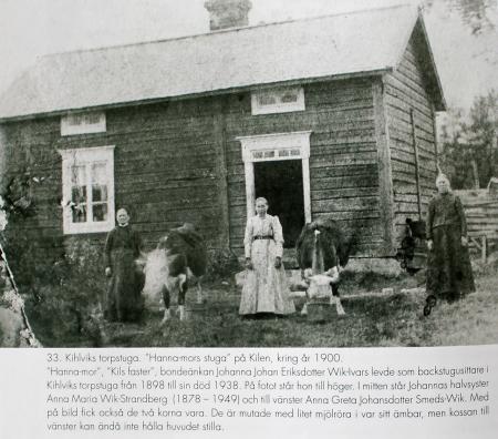 "Hanna-Mors stuga". Från vänster: Anna Greta Smeds el. Wik, Anna Maria Wik el. Strandberg och Johanna Wik el. Ivars "Kils faster". Johanna bodde i stugan från 1898 till sin död 1938. Det är i den torpstugan John Wickström (motortillverkaren) är född 1870. 1873 flyttade hans föräldrar till Västerbacken.