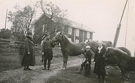 Runar Dahlberg med tre hästar. Vera Dahlberg står längst till höger. Damen med kappan och pojken är okända.
