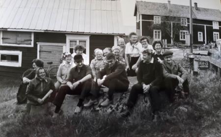 Hembygdsforskargruppen i Kuni i mitten av 80-talet. Gruppen har bjudit in intresserade och är här samlad framför Oskar och Elvi Wasbergs gård med marthagårdens uthus till vänster. I första raden: Irene Forsman, Åke Forsman, Edvin Rabb, Robert Forsman, Sanfrid Forsman, Andra raden: Iris Studd, Elna Forsman, Auralia Rådman, Elsa Örn, Anni Rådman, Elvi Vasberg, Märta Södergård, Estrid Berg, Kjell Herberts och Berit Koskinen,