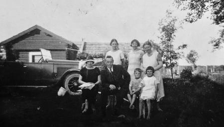 John Wickströms bil med gäster framför boden med datum 1734. Bakom syns Isak Södergårds uthus med halmtak. Av personer känner vi igen Johns hustru Julia som står längst till höger. Stället är Johns bandomshem på Västerbacken.