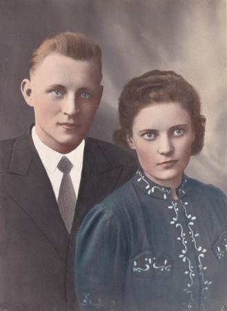 Alfred Lundberg och Ester Örns förlovningsfoto, originalet är svrt/vitt. De gifte sig i Vassor söndagen den 17 september 1944.