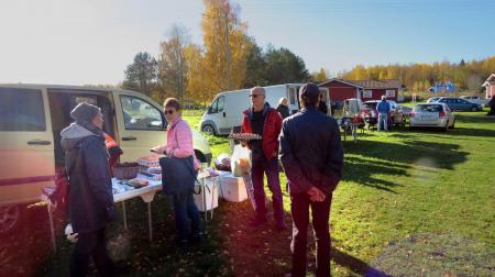 Vassor Marthaförenings höstmarknad 8.10.22. Marknadsbesökarna Birgitta Enroth, Marita och Dan Jakobsson och med ryggen mot kameran Bengt Enroth. Längre bort finns Per Wasberg som sålde kål och Hans och Vuokko Örnberg med sitt försäjningsbord med fårskinn och ekologiskt odlade rotfrukter och grönsaker.