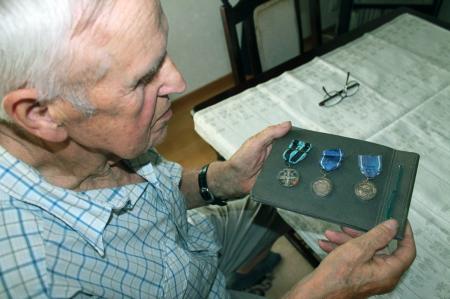 Bror Nyman har tagit han om sin fars, Gunnar Nymans, minnemedlajer medaljer från frihetskriget. Gunnar dog 1936 då Bror bar ett år gammal.