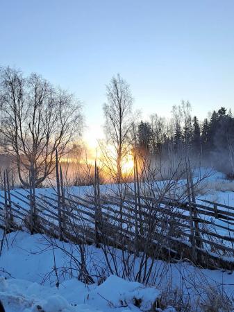 Solnedgång i Vassor, bilden är tagen 23.12.2022 från begravningsplatsvägen mot Brännbacken av Ulla West. Bilden visades i TV-nytt 29.12. 2022. Gärdesgården har byggts av Johan Nyström.