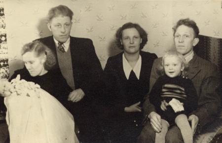 Dopförrättning hos Eskil och Valdine Örn med dopbarnet Krister Örn, Aino Örn Sven Örn och Henry Örn (pojken).