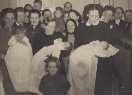 Dop hos Ester och Runar Beijar 1954. Dopbarn: Gun Beijar, Krister Örn och Lilian Beijar