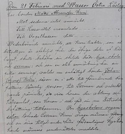 Kuniborna strävade efter egen skola i det östra läslaget. Läsförhösprotokollet från 21 februari 1859 under prosten F O Durchmans tid visa på viss framgång. Läsförhöret hölls hos Matts Abrahamsson Kuni (1828–1867, bonde på Riback). Egen sexman skulle föra frågan framåt. Till uppgiften utsågs Johan Johansson Kuni (1828–1902), bonde på Henrikas.
