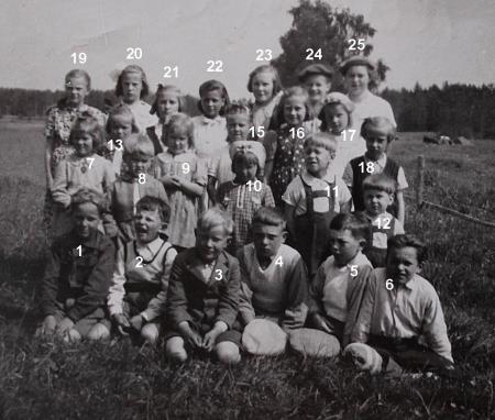 Söndagsskola i Vassor 1950. 1. Rudolf Vestergård, 2. Paul Vasberg, 3. Vilbert Rabb, 4. Edvin Rabb, 5. Gusten Frantz, 6 Åke Frantz, 7. Barbro Hinders, 8. Kaj Öman, 9. Gunvi Rabb, 10. Inger Vasberg, 11. ?, 12. ?, 13. Carita Frantz, 15. Ing-Maj Heir, 16. Gun-Maj Strandberg, 17. Birgitta Rabb, 18. Birgit Strandberg, 19 Britta Rabb, 20. Siv Vasberg, 21. Rose Rabb, 22. Marita Hellman, 23. Elvine Rabb, 24. Gun Britt Öman eller Stig Hinders och 25. Anita Heir var ledare, gifte sig Sandén och flyttade till Västerhankmo. Bilden är tagen bakom bönehuset i Trättgärdet. Björken i bakgrunden sågade Bertel Wik ned på uppmaning av Viktor Svarvar. Björken var grov och gav en ordentlig huggkubbe som Bertel har kvar ännu 2023.