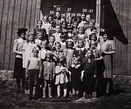 1. Vilbert Rabb, 2. Vivan Åberg, 3, Barbro Hinders, 4. Gunvi Rabb, 5. Rudolf Östman, 6. Viking Åberg, 7. Ing-Maj Heir, 8. Gun-Maj Strandberg, 9. Rose Rabb, 10. Birgitta Rabb, 11. Britta Rabb, 12. Edvin Rabb, 13. Paul Vasberg, 14. Harry Wik, 15. Birger Vestergård, 16. Siv Vasberg, 17. Marita Hellman, 17a. Gusten Frantz (Gustav), 18. Gun-Britt Öman, 19. Harald Aittamäki, 19a. Stig Hinders, 20. Gunvor Östman, 21. Bertel Vestergård, 22. Bengt Vestergård, 23. Herbert Rabb, 23a. Henry Östman, 24. Bengt Nyman, 25. Rut Örn, 26. Elvine Rabb, 27. Anni Nyman, 28. Ros-Maj Vestergård, 29. Berit Vestergård, 30. Anita Heir, 31. Astrid Aittamäki, , 32. Alice Uddström, 33. Senny Örnberg. (Alice och Senny var ledare, Bönehuset stod i Trättgärdet, mellan Andelshandeln och Dalas, Pingstvännernas bönehus).