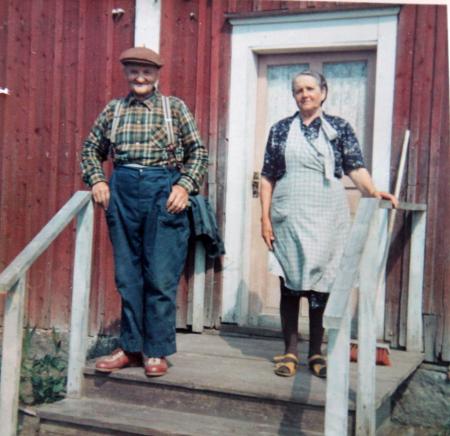 Verner Vestergård (1892-1979) och Elsa Vestergård (född Backman, 1899-1989) på trappan vid Nyback Utibyjjin. Utibyn