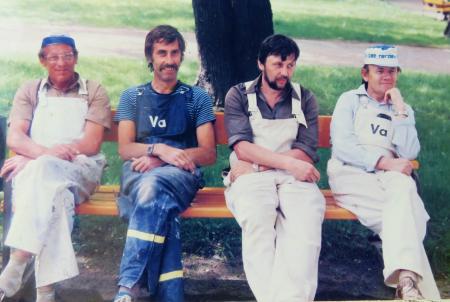 Jarl Håkan Storbacka var under några år i arbete åt Vasa Hussektor. Bilden, som är tagen 1985, visar en del av arbetslaget i parken framför stadshuset där de utförde målningsarbeten. Jarl sitter tredje från vänster.