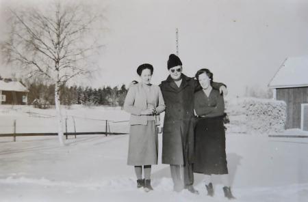 Butiksföreståndare Granberg, biträde Alice Uddström (t.v.) och inhoppare Siv Vasberg bakom Andelshandeln i mitten av 1950-talet.