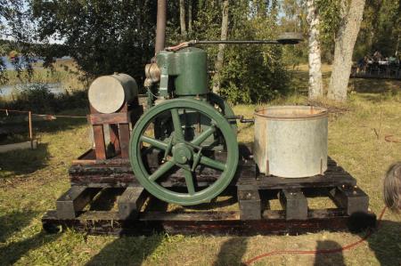 En liknande motor drev också de tröskverk som Alfred Lundberg handhade i början på 50-talet innan elmotorn kom . Kylningen av motorn skedde genom att vattnet pumpades från plåttunnan, genom motorns kylkanaler upp till strilen högst i bild.