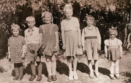 Fr.v. Gunvi Rabb g. Småros, Vilbert Rabb, Rose Rabb g. Sandvik, Siv Vasberg g. Wik, Paul Vasberg och Inger Vasberg g. Smeds.