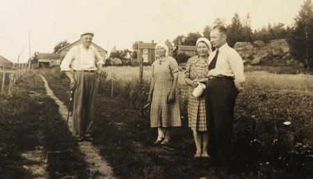 Fyra personer framför Riback. Fr.v. Helge Åkerberg (fotograf), Ida Kuni, Tilda Kuni och Johannes Kuni (skofabrikören). Hemgården i bakgrunden.