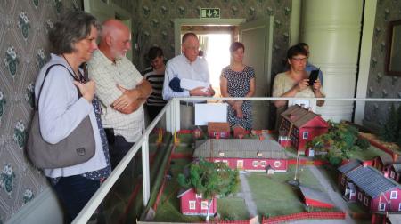 Amerikaättlingar på besök 12.8.2023. Det var här på Tottesund deras mormors mor och far tillbringade 10 år och under tiden födde 3 barn innan de flyttade till Smedis i Vassor. Från vänster: Martha Creaser, Carl Creaser (Marthas mormor Ellen gifte sig med Svanbäck i Munsala och emigrerade till USA), Jessica Forsman, Charles McKee, Marie-Louise Forsman och Leif Rabb (skymd). Smedisättlingen Gösta Forsell har stor del i bygget av miniatyrmodellen av Herrgården.