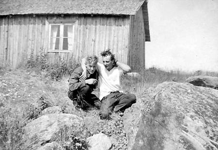 Håkan Lundberg och Birger Westergård, bror till Rolf och Bertil, på Aspskärsgrundet i Mickelsörarna midsommaren 1963.
