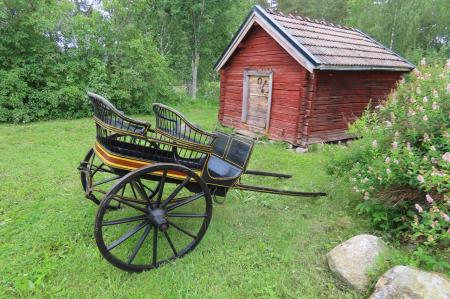 Häck-kärra framför boden vid Åbergs på Västerbacken. Kenneth Åberg fick kärran av sin farfars kusin, Hulda Södergård, som tack för hjälp med röjningsarbete.