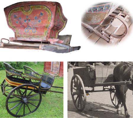Uppe till vänster en schäs, till höger en schäs med resårfjädring, nere till vänster en häck-kärra och till höger en linjalkärra.