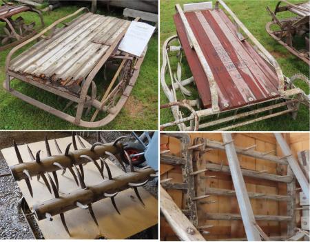 Uppe till vänster: Forsbergs harv som han fick patent på tack vare mekanismen för snedställning av axlarna. Till höger: En Hankmoharv tillverkad i Jakobstad mekaniska vekstad. Nere till vänster: En torvharv. Till höger en pinnharv eller fykantharv.