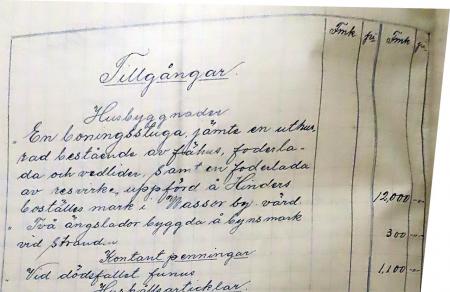 Anders Uddströms bouppteckning har renskrivits av Israel Wasberg och får tjäna som exempel på Israels fina handstil. Anders var Alice Uddströms farfar och bodde nära skolan på Lillön. I sitt andra gifte var Anders gift med Strand-Mari (Maria Wiklund). Otto Östman var andra bouppteckningsförrättaren. Läs mera...