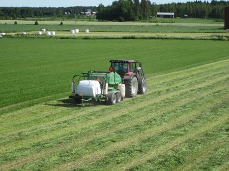 Inplastning av gräs, en balmaskin i arbete. I bakgrunden: Uthuset till höger är Forsells (Mikael Frantz) och gårdsgruppen till vänster tillhö Roland Frantz och Terese Frantz.