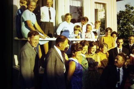 Uppe till vänster ser vi Christin Åberg, lite skymd av Agda Östman, Robert Östman, Gerda Åberg, Rune Östman och Tage Östman. Framför dem sitter Catarina Svarvar och Helena Svarvar, Marianne Wiik och Gertrud Wiik. Nere från vänster: Bror Erik Wik, Roger Östman, Inga-Lisa Östman, Ann-Mari Östman, Gunvor Svarvar, Christina Rådman, Nils Rådman och Johannes Wiik. Längst fram sitter Rudolf Östman. Skymda är Vivan Wik bekom Roger Östman och Viking Åberg bakom Agda Östman.
