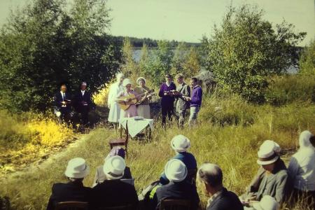 Vassor fria församlings sommarsamling på Bodstranden 1967. Sångarna från vänster: Signe Bäck, Elin Öman, Gerda Åberg, Ole Åberg, Tage Östman och Rune Östman. Talare i bakgrunden till vänster Robert Östman och till höger Viktor Svarvar.