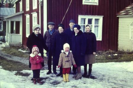 Samling vid Åbergs på Västerbacken. Från vänster Gunvor Svarvar, Arvid Åberg, Agda Östman, Robert Mälsor, Hildur Mälsor, Gerda Åberg samt barnen Catarina Svarvar och Helena Svarvar.
