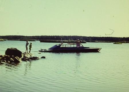 Från Lillöstranden sett. Båten kallades Raketen. I båten, Tage Östman och okänd. På stranden Catarina Svarvar och Helena Svarvar. Läs mera...