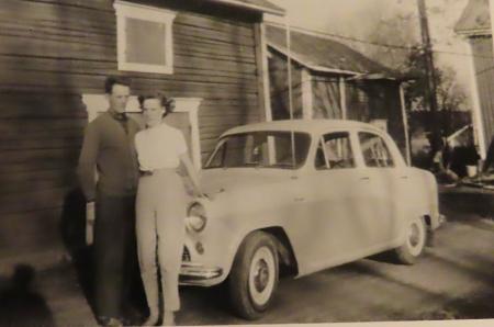 Siv Wik f. Vasberg och Bertel Wik vid Sivs hemgård på Brännbacken. Bertils personbil är en Austin 4 D Sedan A 50 - 2520 årsmodell 1956. Bertel köpte bilen i Tervajoki av Toivo Rinta-Jouppi 1958, i byte gav han en motorcykel och en mellanpenning. Toivo startade firman 1950 och hade sitt kontor i bondstugan. Sönerna Rinta-Jouppi hade villa söder om "Abbisis" på Sandåsen.