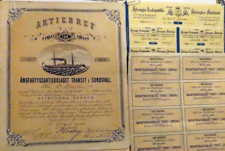 Aktiebrev i Ångfartygsaktiebolaget Transit i Sundsvall. Utställt på Herr W. Wasberg (Wilhelm Wasberg).