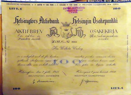 Aktiebrev i Helsingfors Aktiebank. Aktien är utställd på Herr Wilhelm Wasberg och undertecknad av G. Mannerheim och Julius Stjervall. Gustav Mannerheim avgick från HAB:s styrelse 1935.