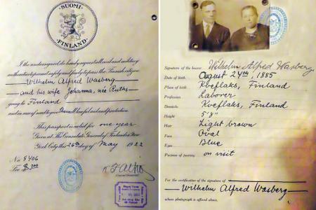 Alfred Wasberg har i USA fått pass till Finland av Finlands Generalkonsulat York City den 26 maj 1922. Till passet bifogades ett identitetsbevis med foto. På grund av att Finland var allierad med Tyskland under första världskriget var förbindelserna med USA tidvis brutna vilket framgår av brodern Oskars brev till hemmet i Vassor. Han var gift med Johanna Ruths från Vörå. De blev bönder i Vallvik från 1922