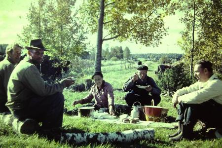 Johannes Wik tröskar. Matpaus i Rössle med soppa, bröd och ägg och dricka. Från vänster: Johannes Grop, okänd, Elisabeth Wik och Johannes Wik (byggmästare och bonde på Grånnbacken) och Bernhard Lönngren (pastor).