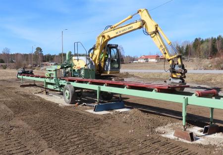 Jan Heir grundade med sin grävmaskin för en blocksåg som blev klar att ta emot stockar våren 2025. Här finns lite motor-, såg- och fågelljud.